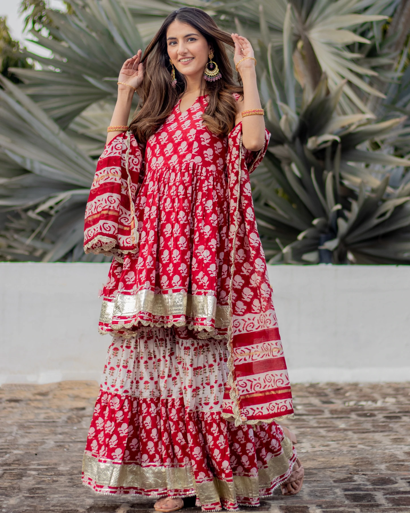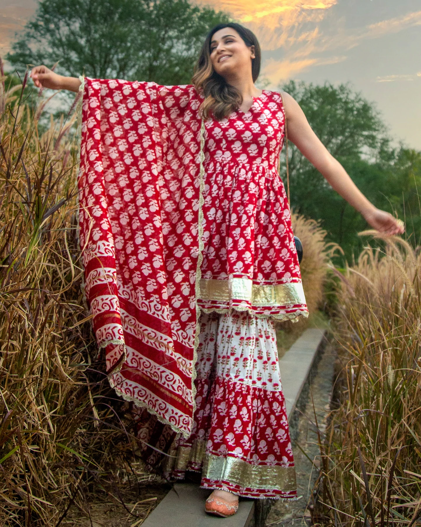 RED PAISLEY HANDBLOCK SHARARA SET